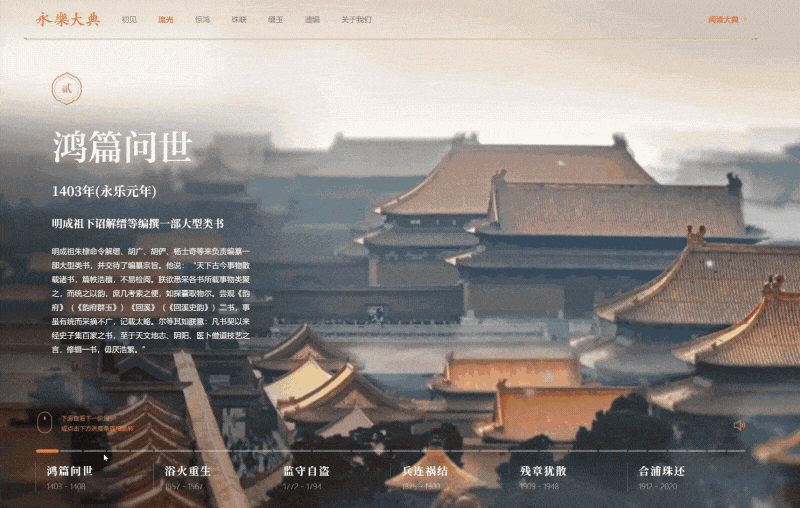 数据库对《永乐大典》的概况、编纂体例、流传大事记、学术辑佚、流散情况等进行生动展示,便于读者了解《永乐大典》这一宏篇著作的成书、传播和回归情况。另外,通过应用背景动画与音效等技术手段,可视化呈现《永乐大典》的坎坷身世。