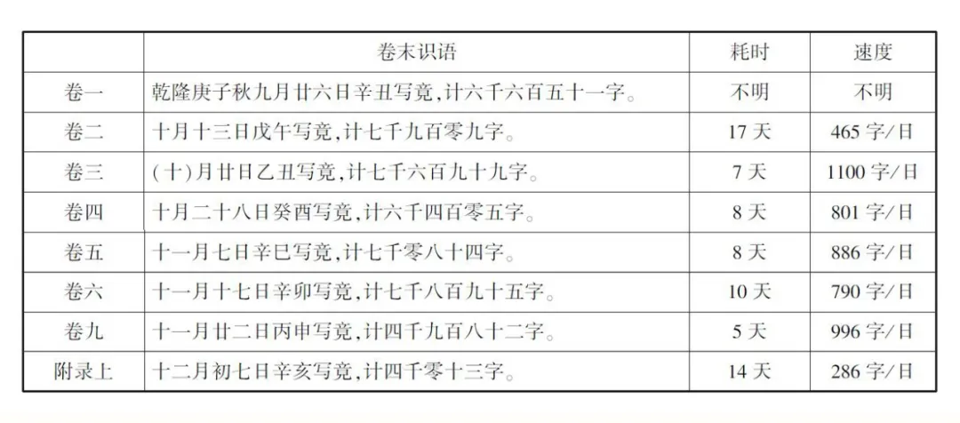此书写样的主力是仁和人方溥。从卷末识语来看(如下表),各卷写样时间密迩相接,且除去头尾的两卷,写样速度集中在800—1100字/日的区间内,这暗示了方某是在连续工作,因此上述数值应较能反映匠人的真实写样能力(较长期连续工作情况下)。值得注意的是,它与金陵书局的数据(1000字/日)相差不大。而卷二与附录上的数值,大幅低于其余各卷,显然不能说明方某的写样能力忽高忽低,而应考虑干扰因素(如因故停顿)所导致的数值异样。