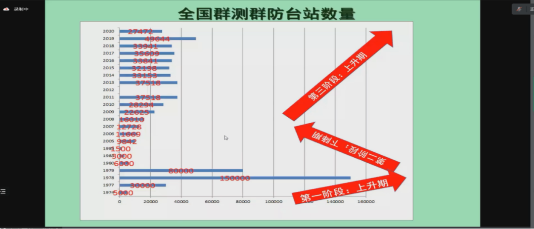 在第一个发展阶段,即上升期内,高老师结合国内国际情况分别进行讲解。高老师认为,国内群测群防发展过程中出现了五个高峰期,包括:第一,1966年3月周恩来总理要求开展地震预报工作;第二,1970年1月全国地震工作会议的召开;第三,1972年11月全国地震中期预报科研工作会议的召开;第四,1974年8月国家地震局云南昭通地震现场会的召开;第五,1977年召开全国地震战线学大庆先进单位、先进个人代表会议的召开。在国际层面,高老师认为有四个反应时期,1976年为第一个国际反应时期,主要表现有日本提出向中国学习怎样预防地震;1980年为第二个国际反应时期,主要表现为中美签订包括地震预报在内的科学技术合作议定书;1984年为第三个国际反应时期,主要表现为里根总统在复旦大学演讲中提到美国学生在中国学习如何监测地震;1996年为第四个国际反应时期。(见图7、8)