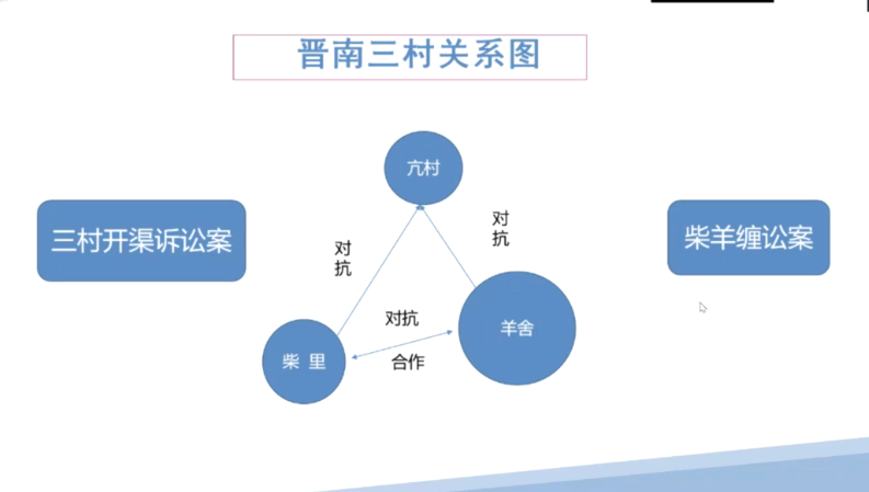 第三部分张教授探讨了晋南三村的水利社会。他首先对晋南亢村、羊舍村、柴里村这三村的周边地势以及位置关系进行了介绍,并对三村的具体情况运用图片的方式进行解读。其次重点讲解了三村洪水资源开发利用的基本态势,并对晋南三村水利纠纷事件提出了自己的几点认识。最后分析了洪灌型水利社会在当代终结的原因。