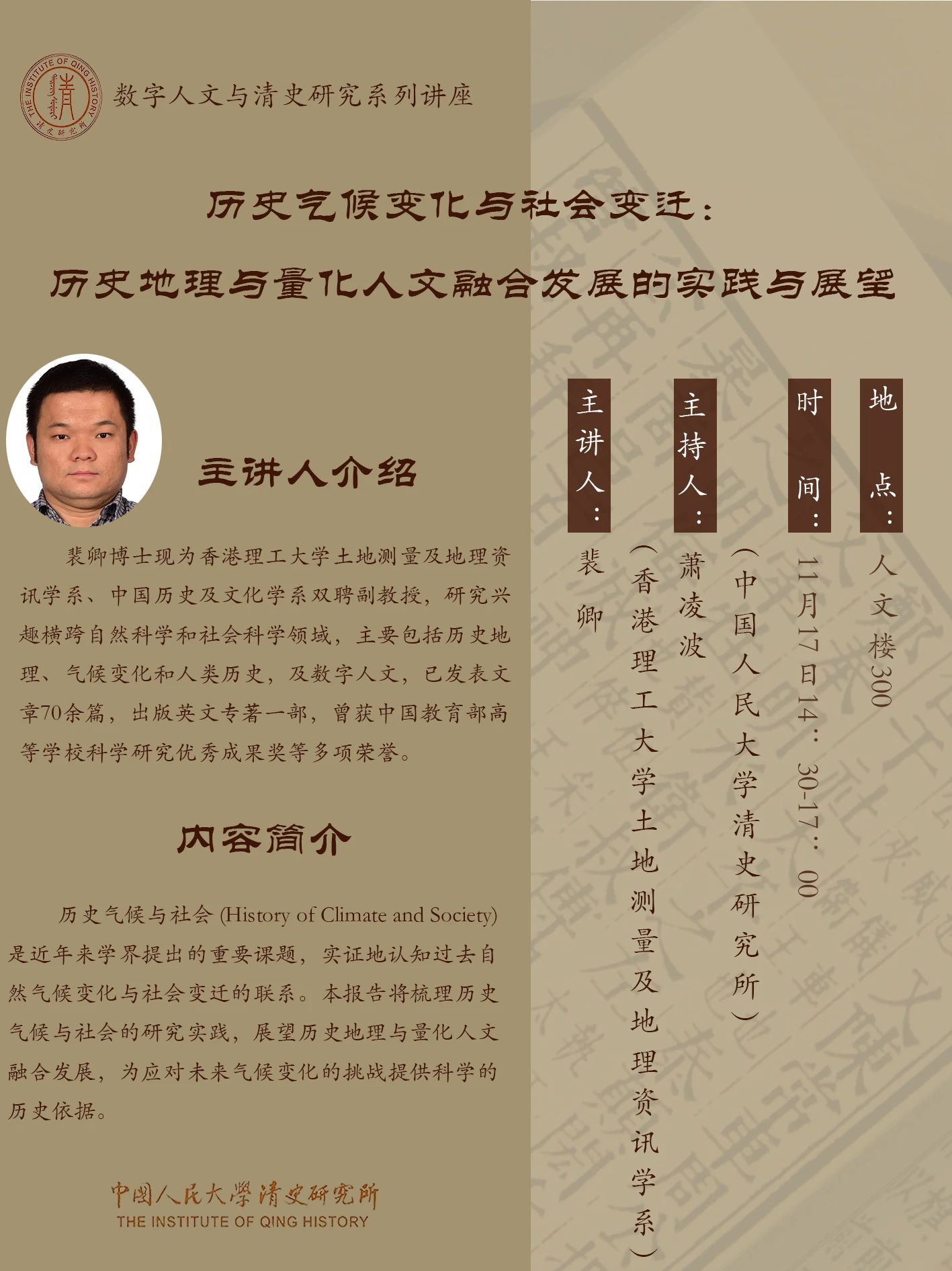 | 讲座 | 历史气候变化与社会变迁: 历史地理与量化人文融合发展的实践与展望 |