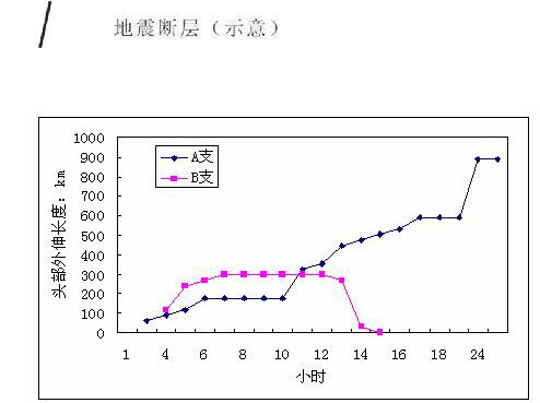 2005年10月8日巴控克什米尔7.8级地震前,9月7日北京时间2时(世界时9月6日18时)起,至9月8日01时(世界时9月7日19时)结束,时长23小时。震区分两支:暂称A支和B支。A支235°,B支270°,相差45°。A支先出现,2时头尾长60km;B支4时出现,长118km。后都增长,B支比A支快,至7时两支分别长至178和296km时,头部变粗;10时两支混为一体;12时A支突出,13时B支开始萎缩;15时B支消失,18时A支增长至592km时,头部突然向270°延伸237km,19时长至296km。9月8日0时A支长888km,但后部444km消失,说明震区供气结束。