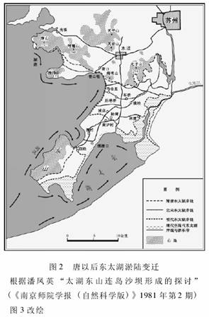 东太湖湖田在东、北、西三个方向上有一个整合过程。在太湖东岸,由于出水口北移,清代湖田在东北部出现大扩展。吴江湖田明代多有坍涨,西坍东涨。大缺口封闭后,环流中的泥沙很难转到别处,湖田外涨甚速,坍湖减少。西部横泾平原的湖田河网这时发育完善,由于出水不利加上快速淤塞,东山北部的大缺口出现并很快淤塞闭合。胥山和洞庭东山之间的大缺口的淤陆到清代发展形成太湖中间的大量的湖田。北部的湖田在很早就开始形成,大部分淤陆基本上沿着北岸进行,东山东北部和东南部自明代就形成一定的淤滩线,大部分的湖田和湖滩基本上在清代形成。见图2