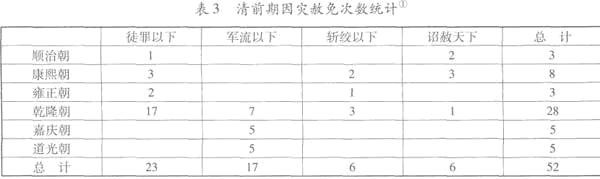 尽管具体的灾荒观不尽相同,清代帝王都把清理刑狱视作防灾救灾的必要手段。每逢灾异必“抚躬循省”的康熙帝指出“刑狱或有淹滞,冤抑之气,最能上干天和”。[5](卷103)一向“恶闻灾异”的雍正帝也认为“刑名为国家之要务,上关天和,下系民命”,把刑狱未能清理视为“天时亢旱之”。[7][卷16]乾隆帝为方便各省及时省刑弭灾,于乾隆八年将天旱清理刑狱的条文写入《大清律例》,规定除徒流等罪外,各案内牵连待质及笞杖案内情有可原者,督抚一面酌量减免省释,一面奏闻。嘉道及至晚清的列位帝王也都无不以“省刑为荒政之要著”,[1](p535)并将因灾恤刑逐步制度化。下表是我们就清前期历朝因灾荒而清理刑狱次数的一个粗略统计。
