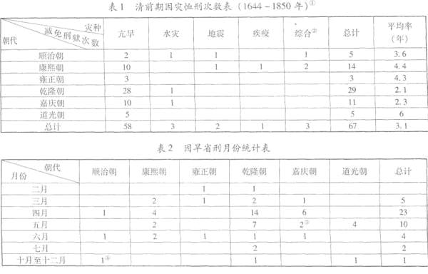 从表1看,水旱灾害、尤其旱灾是导致因灾恤刑的重要因素。表2反映了因旱清狱减刑的时间大都集中在每年农历的三月至六月。究其原因,一方面是因为在“农务为国家之本”的农业社会中,春夏久旱对农作物的生长隐忧很大,所谓“旱一片,涝一线”。另一方面,就统治者而言,从天人感应的角度看,农事方殷之时天气亢旱,其警示显然更具典型性,“天行之愆,人事之失也”。[5](卷103)与水灾、地震的发生相比,旱灾发生速度较慢,在其早期可以通过天人感应而减缓旱象。明清时期的救荒思想家皆认为,“天灾不一,有可以用力者,有不可以用力者。凡水与霜,非人力所能为,姑得任之”,对于尚可以能用人力抵抗的旱灾,为政者要“速为方略以御之”。[3](第1卷,P373) 从频率来看,乾隆朝每2.1年因灾清理刑狱一次,在历朝中最为频繁。其中,在乾隆朝的前20年中,有12年均因天旱恤刑。⑤这些数据可以部分地反映灾害、尤其是华北地区旱灾发生的频度,当然仅仅由此做出推断显然不够科学和严谨。因为一般来讲,清理刑狱多半都在春夏旱象初显而尚未成灾之时,有的年份在清狱缓刑之后,刚好出现了足以缓解旱情的降雨,自然构不成灾害。比如雍正二年二月,因为雨泽愆期,时有大风,雍正帝谕令刑部“当钦恤民命,无得牵连多人,久行羁禁”,刑部遵旨释放了数百人。到三月初五,即“甘霖大沛,远近霑足”,春旱的险情消除,雍正帝由此慨叹“天人之感,捷如影响,莫谓适逢其会,事属偶然也”。[7](卷17) ____________________________ ①表1、表2均据《清实录》、《清史稿》、《清朝文献通考》、《清会典》等部分资料整理。因本文着重关注因灾害恤刑的状况,清代因星变等异象而发生的恤刑不在统计之列。 ②综合指涉及两种灾种以上者,如康熙三十四年,因直省旱潦、山西地震,诏赦天下。 ③含嘉庆五年闰四月初二日一次。 ④顺治十一年十一月十六日,因地震屡闻,水旱叠告,顺治帝降诏大赦天下。(《清世祖实录》卷87) ⑤没有因旱减刑的年份为乾隆元年、六年、十一年、十三年、十四年、十六年、十九年、二十年。 值得注意的是,一年中因灾清理刑狱的次数有时不止一次。其中或者因为灾象在同一地域持续,或者因为灾害在不同省份发生。如乾隆二年先逢太庙建成诏赦天下,三月因天时亢旱,命免缉应赦各犯并省释枷责轻罪,四月,因旱象加重,“已逾兼旬”,又令刑部重审雍正四年至十三年所有不赦各案及秋审屡经缓决之犯,将“有一线可原应行减等者”酌定请旨。[8](卷39、40)乾隆七年,减免刑狱的次数也有两次。三月,因北京、直隶、山东、江南等地雨少,虽经祈祷而雨未霑足,令刑部及其他诸省省释轻罪人犯,八月,又因安徽、江苏两省被水严重,“非常年可比”,将两省秋审人犯减等完结。[8](卷163、173) 从因灾恤刑的期限来看,一般不宜太长,尤其不能明示停止日期。乾隆八年,江南总督陈大受因海州等地被灾,奏请将减刑日期延至次年麦熟后停止。乾隆帝以为,若明定减刑清狱期限,实际上是“诱民为非”,会使小民以为在期限之内可以触法抵禁,肆行无忌。[8](卷201)嘉庆十六年,嘉庆帝将祈祷雨泽、减免案犯的时限定在大沛甘霖三日之后再行截止,以后天旱恤刑的期限一般均照此办理。 二、清代因灾恤刑制度的主要内容 “天人合一”、灾异天谴说是清代因灾恤刑制度的重要思想基础。此外,因灾恤刑制度也是清政府保证灾荒时期社会生活正常运转的重要手段。被后世视为救荒圭臬的《周礼》十二荒政中其三为缓刑。“缓刑,舒民心也”。统治阶层一方面冀望通过广颁“法外之仁”来缓和灾荒时期潜伏或显现的较平时更为激烈的社会矛盾,因此对“一切刑狱奏谳,尤加矜恤”,[5](卷239)另一方面,也需要法律的保障来维系社会秩序的稳定。概括起来,清代因灾恤刑制度的主要内容大体包括几个方面。 其一,清理积案重案。冤案积案都是上干天和的重要原因,“刑狱关人生命,无论枉狱大干天地之和,即罪可矜疑,莫为省释,以致囚系太繁,悲愁郁结,亦足酿诊而召灾。”[3](第4册,p285)因此,与救灾相感通的关键显然就是拔冤宣滞,选派要员审理重案要案。以康熙朝为例。康熙元年,因畿辅少雨雪,上谕严饬刑部严治官员不职之罪,“凡两造口供不全录即为作弊,引律不确合者即为欺公”,[5](卷6)以求情法平允,无枉无纵。康熙七年、九年、十年、十四年、十六年、十八年、十九年、二十一年、二十五年、二十六年、二十八年,康熙帝均因天时亢旱派要员会同刑部将监内重犯确审具奏,并将已结大案逐一详审,以求“狱无冤滞,以迓天和”。[5](卷55、67)而巨奸大盗的存在也是发生灾异的重要原因。雍正二年,由于湖南连年荒歉,雍正帝认为这与该地频发的政治案件大有关联,比如曾静、张熙投书川陕总督岳钟琪策划反清案,“地方有此等逆天悖理之人,以致旱涝不时”,因此决定在湖南设立观风整俗使,以劝谕化导,求得天人感应。[7|(卷78)除此之外,逃罪犯潜藏之处也易造成诊气而阻遏祥和。因此,追缉在逃罪犯以速结案也是清讼的重要方式。嘉庆二十二年,京畿等地干旱,嘉庆帝即严令步军统领衙门等于一月内侦缉潜藏附近的50多名逃犯,以消诊气而召和甘。[9](卷331) 其二,因灾赦免。清代赦免罪囚有恩诏、恩旨之别。逢皇帝寿辰及一切庆典而肆赦者谓之恩诏,恩诏条款疏阔,典礼隆重,一般要在天安门颁布,行文