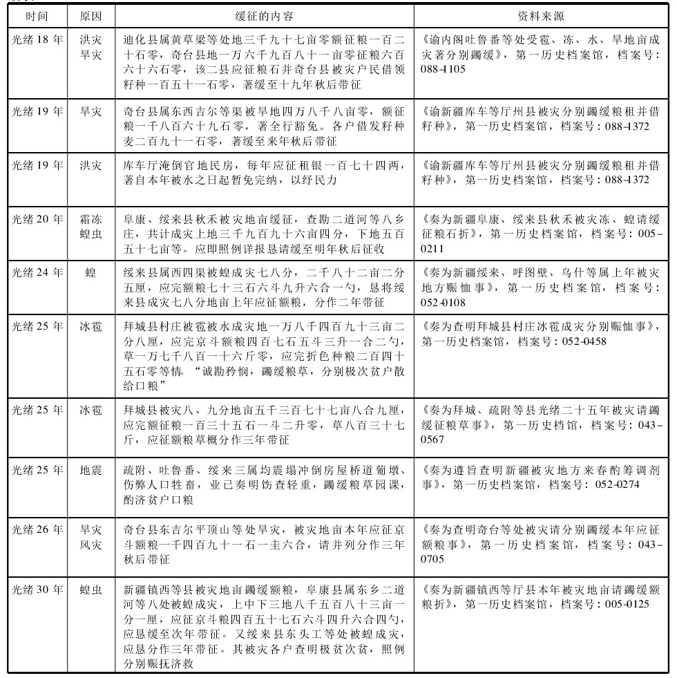 鉴于新疆特殊的自然条件,自然灾害多,乾隆帝曾要求制定采取豁免和缓征的条例。乾隆二十八年(1763)正月,“驻回城大臣等遵旨定议《回人耕种地亩,遇有偏灾豁免缓征条例》”。[12]清政府对缓征的规定如下:被灾十分、九分、八分者蠲剩钱粮,从此年起分作三年带征;被灾七分、六分、五分者蠲剩钱粮,从此年起分作两年带征;被灾五分以下一般缓至次年征收。由于新疆边远,与内地不同,具体实施缓征时情况比较灵活。乾隆三十二年(1767)三月,“谕伊犁回人屯田等,按年拖欠应交麦谷,共七万八千七百余石,已著展限为四年带征。但念去岁伊犁歉收,若于今岁收成后,即将带征之项,与本年征项粮石并征,究恐生计拮据,将本年应行带征麦谷一万九千六百余石,全行豁免,以纾民力”。[13]道光十五(1835)正月,蠲缓乌鲁木齐宜禾县上年被旱村庄新旧额赋有差,贷灾民半年口粮。[14]