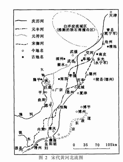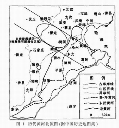 实际在地质学上有明确的认识。显然,地震活动作为构造活动一种强烈表现的形式,特别是位于华北平原中部的地震构造带,由于强烈的地震沿构造带反复发生,也应当影响黄河河道的演变趋势。 吴忱等研究了华北平原地面古河道后指出:“漳河裨沱河唐河甚至包括了黄河古道,在流出洪积扇进入平原之后,不是径直东流入海,而是作北东方向流动一段距离以后才东流入海 15 , " ,明显受到基底活动构造的影响。同时华北平原基底活动构造活动的研究揭示了华北平原总体运动有向北、向东掀斜的趋势 16 ,。也就是说,北流的方向应朝向华北第四纪的沉降中心-一渤海中部。宋代历史上治河也有“东流高仰,北流顺下”的说法,实际上就是今天构造活动的因素。这都说明古代黄河北流主要是向着北偏东的方向,因此北流的河道主要的分布应在河北平原的中一东部一带。 华北地区作为新生代裂陷盆地,在构造发育上经历了古近纪(早第三纪)、新近纪(晚第三纪) - 第四纪两个活动性质完全不同的构造阶段。古近纪的构造活动主要是多条北北东方向大型拆离断裂系统控制的伸展构造。新近纪一第四纪华北地堑系统总体下沉,接受了巨厚的松散沉积物,同时构造活动的性质出现了巨大的改变。一些早第三纪强烈活动的断裂或断裂带,包括北北东方向太行山山前断裂带和沧东断裂带等,活动性大大减弱,以至消失。同时新发育了多条新生的活动断裂带,平原中部北东方向的唐山一河间一磁县断裂带 17 , 就是一条新生的地震构造带。该造带控制了一系列的强震发生,例如著名的唐山大地震柯间地震、邢台地震等。这一认识是近年来地震地质学科的重要科研成果。在这种基底构造的控制下,地表的河流的流向和沉积物的基本走向亦应为北东一北北东方向。这一结论与前面诸多研究成果一致,北流的河道应主要受唐山一河间一磁县地震构造带的制约。在太行山前附近,由于不具备发震的地震构造背景,因而不可能发生史前巨大的地震。 器测(仪器观测)时代,世界上记录到最强烈的地震是 92 级,发生在南美的智利,位于板块的边缘。中国是历史地震记载最为丰富的国家,地震类型是板块内部类型,历史上东部记载最强的地震是 1668 年山东省郑城一营县的 85 级大震。现代大量的地震地质考察已经证实,这些强震大大改变了当地的地形地貌景观。尽管如此,也没有发现如任美鄂先生描述的、足以容纳一条大河的巨型沟谷。可见一次强烈的地震,由于震级和释放能量所限,不可能造成黄河规模巨大的改道。正确的认识应当是,强震带一定是现代强烈活动的地质构造带。地震活动主要沿着构造带迁移、重复发生,造成了地表的破坏、沉陷,这种性质活动的背景往往影响了地表河流的发育和迁徙改道的基本特点。 3 白洋淀特殊小流域的成因与北流的河道问题 历史上黄河北流路线从来没有到达平原的西部,进入白洋淀流域地区。包括历史记载比较准确的宋代黄河北流。北流的多条路线也只是到达了这一区域的边缘,再转向北东方向,穿过了德州一沧州这一走廊,进入海河附近(见图 1 、图 2 )。这是个一直让人困惑的问题,近年来的研究成果可能提出了一个比较令人信服地解释。 白洋淀流域区位于河北平原的中西部,它是河北平原地表水系发育最为丰富的地区。但是却没有规模较大的河流,区内发育的河流与北部的永定河、南侧的黄河流域相比,河流的形态规模不同,河曲发育柯流短小棍地与湖泊发育,并独自成一系统注入白洋淀(图 3 )。它们夹持在黄河和永定河两大水系流域之间,但不受上述两大水系的影响,做为一个特殊的小流域区独立存在。