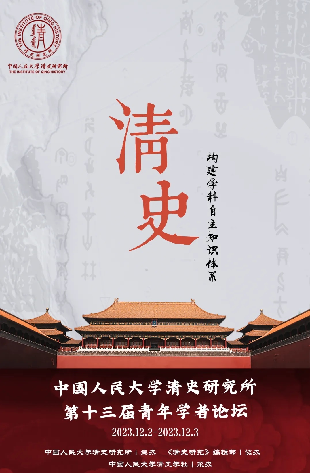 2023年12月2日至3日,第十三届中国人民大学清史研究所“青年学者论坛”顺利举办。本届论坛以“建构清史学科自主知识体系”为主题,共收到68家高校及科研机构投稿208篇,最终有来自中国人民大学、北京大学、清华大学、香港中文大学、美国威斯康星大学麦迪逊分校、日本京都大学、日本名古屋大学等海内外35家高校及科研机构的81位青年学者参会,标志着论坛的规模与水平达到一个新的高峰。入选论文内容包罗广泛、方法屡现新意,既有以细节见整体的个案研究,也有对大历史大理论的凝练概括;既有对传统问题的再挖掘,也有对国际学术热点的回应;既有对优良史学传统的继承,也有跨学科的理论与方法尝试,反映出广大青年学子尝试从方法、路径、观念、史料多个角度思考“建构清史学科自主知识体系”的当代清史学术命题。活动情况更是得到中国人民大学官网、官微和校报的推广和报道,在校内外取得广泛影响、赢得好评如潮。