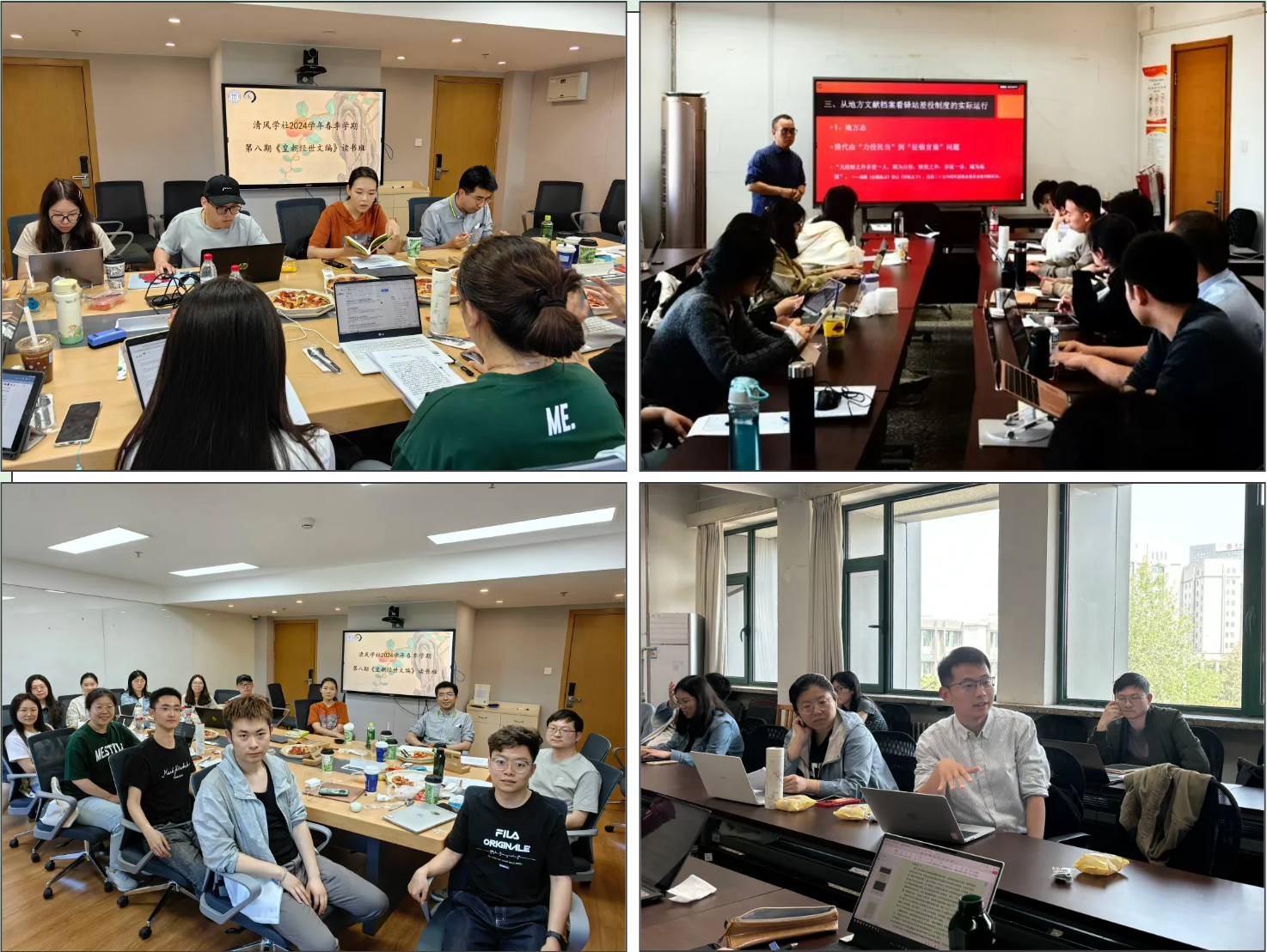 为进一步提高学生的基本史学素养,夯实清史史料学功底,清风学社于2021年开展《皇朝经世文编》读书班,以老师领读、学生集体讨论的形式精读清代政治、经济、社会、文化等不同主题的经典文献。2024年春季学期,学社共举办8期活动。本学期读书班活动范围延伸至本校不同年级、专业学生,并在继续邀请历史学院教师领读的基础上,邀请到多名校外青年教师主讲或与会讨论。考虑到活动在中午开展,学社还不断深化服务意识,为无暇用餐的师生们提供果盘、茶点;部分场次以午餐会的形式进行活动。每次读书会上虽然没有满汉全席,参与者却享用到一场场“精神盛宴”,不但在轻松愉快的氛围中交换观点,深化对史料的理解,还增进了深厚情谊,共同营造了浓厚的学术氛围。下学期学社将继续举办此项活动,并拟以线上、线下相结合的方式扩展参与规模,提升讨论水平。