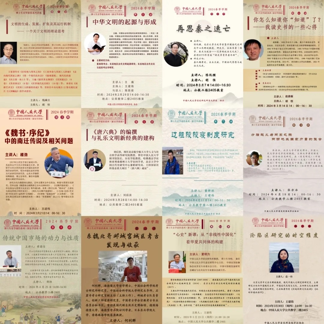 2024年春季学期,清风学社继续协办博士生“史学前沿”系列讲座。本学期共开展14讲,邀请到北京大学历史学系钱乘旦教授、中国社会科学院考古研究所王巍研究员、浙江大学社会学系赵鼎新教授、美国博伊西州立大学历史学系Lisa Brady教授等海内外著名学者讲学。讲座内容覆盖中国史、世界史、考古学等历史学一级学科,兼顾理论与实证研究,并吸收跨学科研究方法,对博士生追踪学术动态、拓展学术思路大有裨益,吸引了校内外广大师生积极参与。