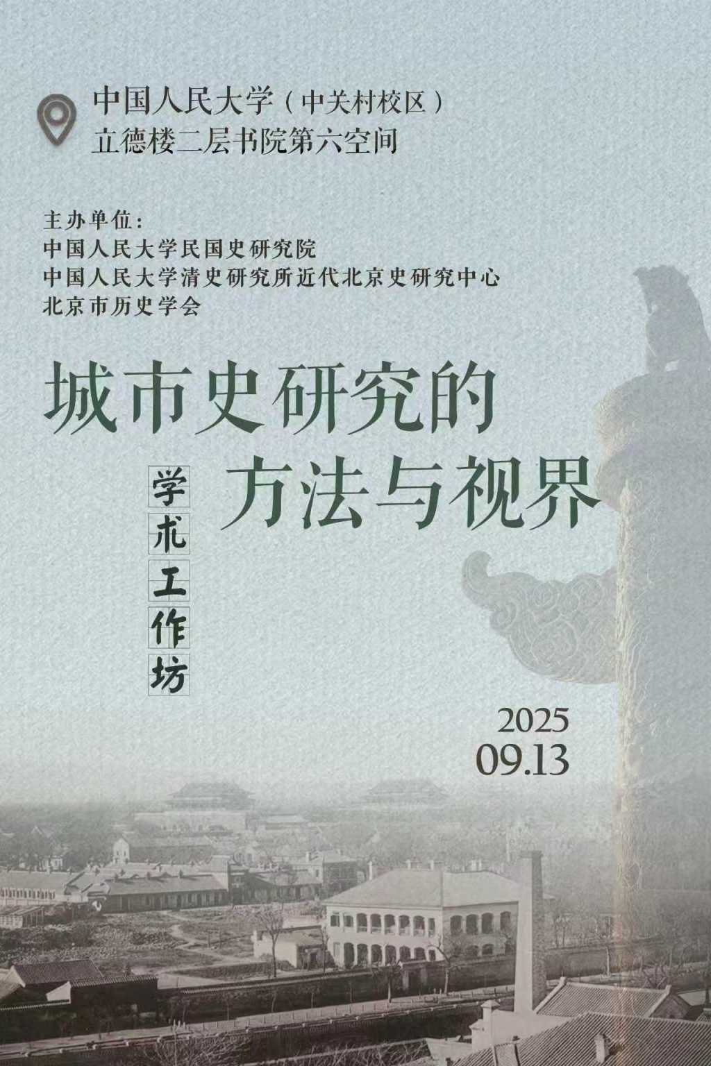 2025年9月13日,由中国人民大学民国史研究院、中国人民大学清史研究所近代北京史研究中心、北京市历史学会主办的“城市史研究的方法与视界”学术工作坊在中国人民大学举行。来自国内各大高校、科研院所的二十多名参会者,围绕中国城市史研究的方法、视界以及微观议题展开深入交流,共同推动城市史研究的对话,反思中国城市史研究的问题,探讨城市史研究的未来发展路向。