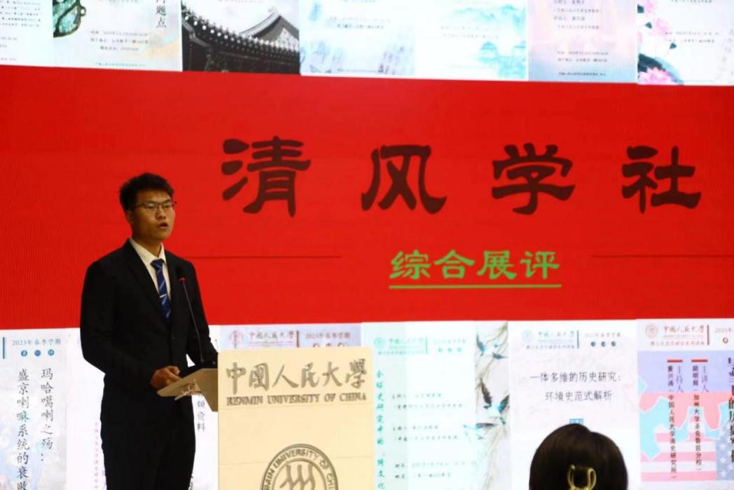 清风学社隶属于中国人民大学清史研究所,是由学生自主创办、以研究生为主体的学生学术社团。自2003年创立以来,清风学社始终秉承优良传统,在活跃学术氛围、增进师生交流、彰显清史所学术声誉等方面发挥重要作用。目前学社由历史学院和清史所管理、胡恒老师指导,社团成员为清史所全体硕、博研究生,共有约150人。学社机构完善、运行良好,目前由第二十一届理事会8名成员和硕、博士一年级41名新生共同负责社团的日常运营工作。2022年,学社曾获评中国人民大学“五星学生社团”。本次展评会上,清风学社副社长陈家佑围绕组织建设、理论学习、活动开展、宣传建设、社团风采、社团影响六个方面,分享社团的成长故事,展现社团建设发展成果,赢得了在场评委的一致好评,最终学社再次顺利荣膺“五星学生社团”称号。